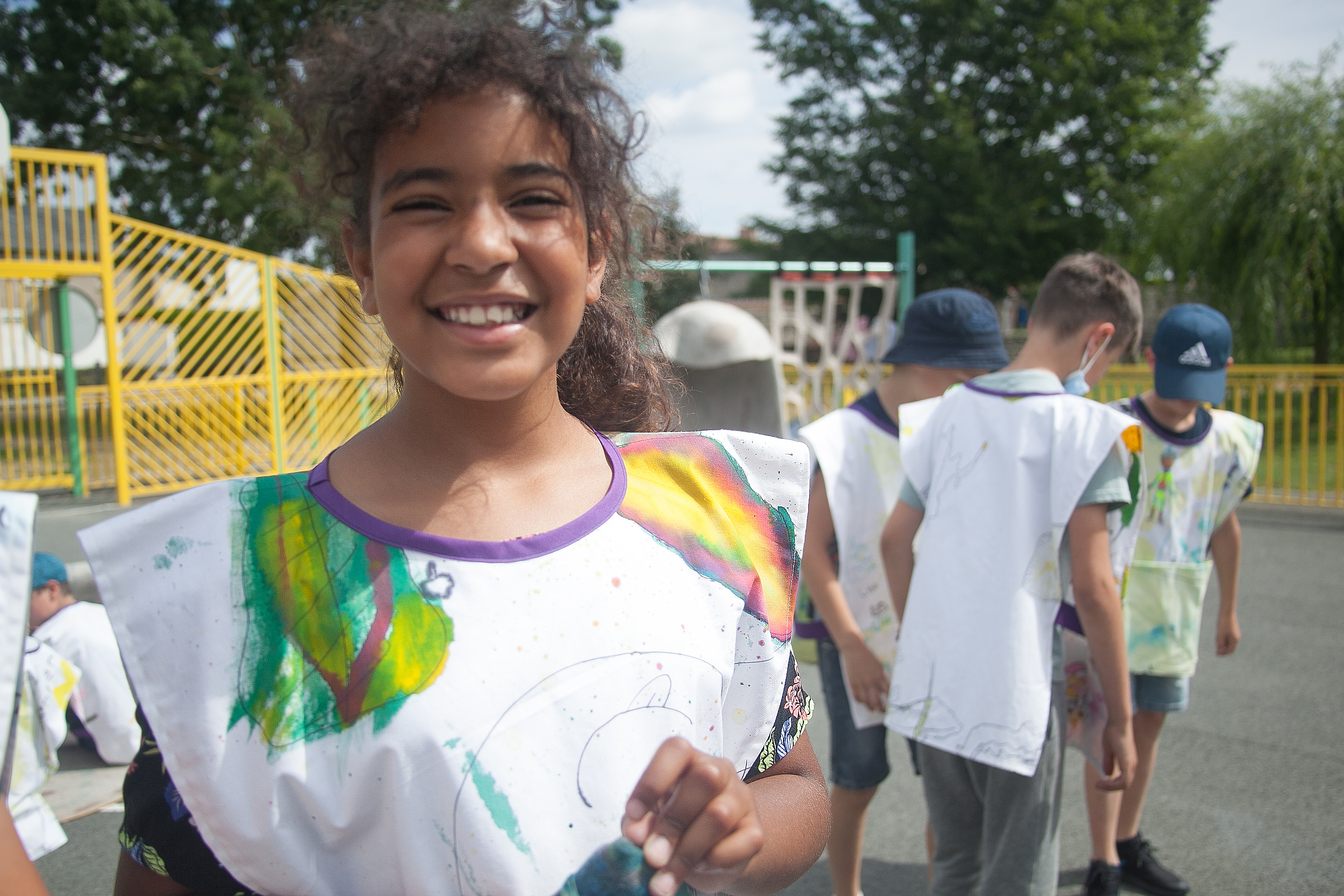 Nous avons consigné nos idées et réflexions sur un tissu, qui est ensuite devenu à la fois un matériau pour confectionner un vêtement de travail et un support de communication du projet lors de la parade de restitution.